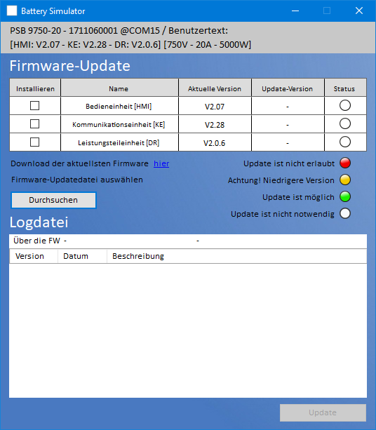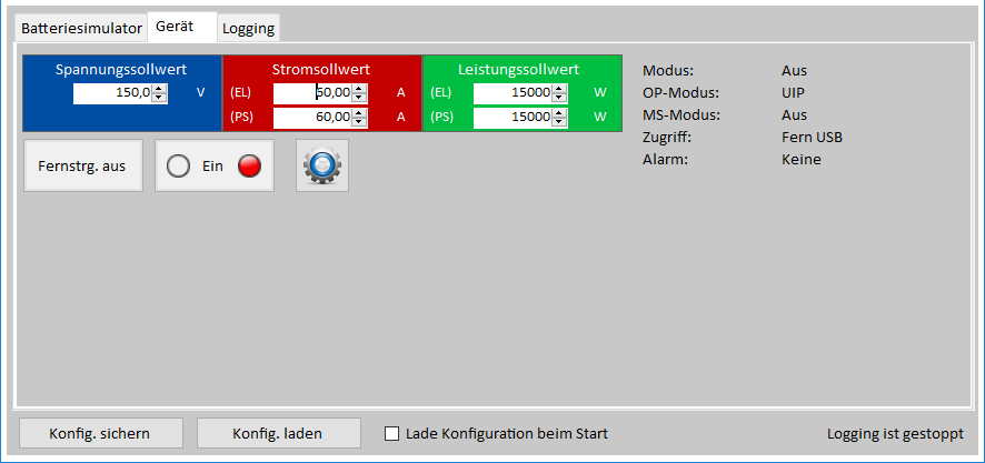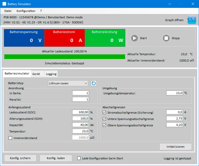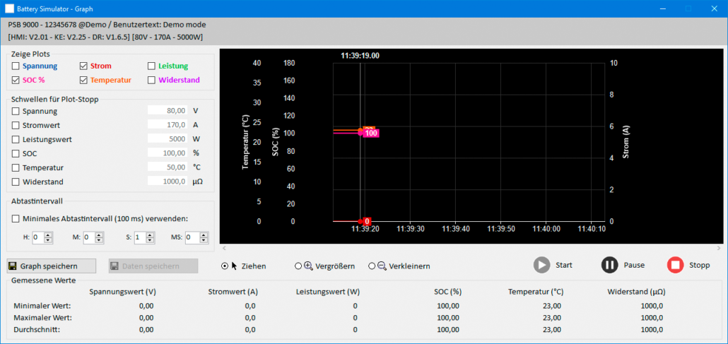 물리적 시뮬레이션은 전원 공급 장치에 의해 수행되며, 테스트 실행 중에 소프트웨어에 의해 대부분 자동으로 제어됩니다. 사용자는 또한, 로그 파일에 대한 데이터 기록을 활성화하고 컬러 그래프 창에서 시각화 할 수 있습니다.
