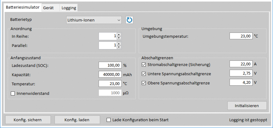 이 소프트웨어는 충전 또는 방전시 전기 및 화학적 특성을 포함하여, 납산 및 리튬 이온 배터리를 시뮬레이션 하는데 사용됩니다. 이는 독일의 유명한 프라우엔호퍼 연구소와 협력하여 개발 및 수집된 값 테이블 및 파라메터 라이브러리를 통해 구현 됩니다. 대상 용용의 요구사항에 맞게 조정할 수 있는 전환 가능한 배터리 프로파일은 배터리 용량, 내부 저항 또는 충전 상태와 같은 기본 배터리 파라메터 뿐 아니라 주변 온도와 같은 테스트 파라메터도 정의합니다.